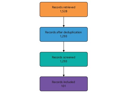 Flow diagram of the study selection process for the systematic review: Top to bottom sequence Records retrieved (1,528)→Records after deduplication (1,293)→Records screened (1,293)→Records included (101). Boxes are color-coded to distinguish stages, and arrows indicate the directional flow of records through the screening pipeline. Abbreviations: Preferred Reporting Items for Systematic Reviews and Meta-Analyses (PRISMA); Records = Bibliographic records from databases and sources.